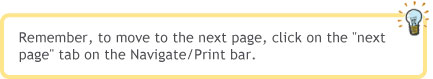 As a first time user, you should always use the navigation tabs on the Navigate/Print bar to move from page to page within the Online Workbook.