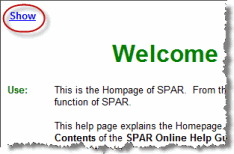 answers in this Tutorial, try using the SPAR online Help Guide. You may access this guide by clicking the "Help" button in the top right hand corner of the application. This will display the Help Form for that specific window. If you would like to view the index for all the help forms, click the "Show" button that appears on each form.