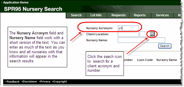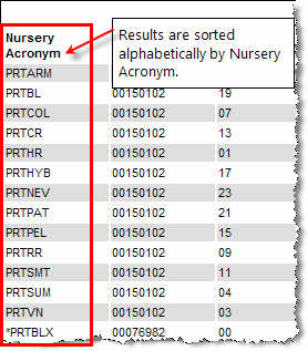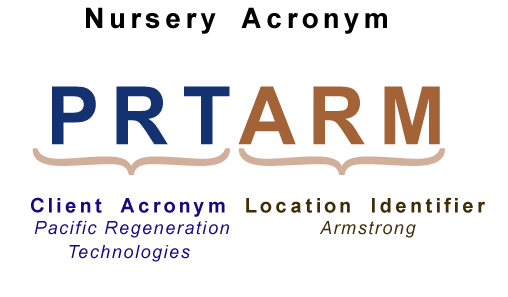Each Nursery has a unique acronym which is based on the Client Number and Location Code and can be up to 8 characters long. Many of the nurseries have only one location (with a location code of 000), so the nursery acronym is the same as the client acronym. In the case where a nursery has more than one location, the nursery acronym includes a unique location identifier.
