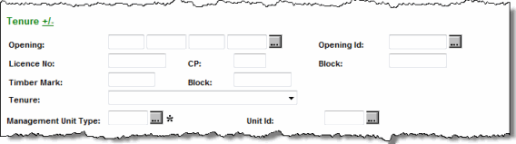 The Tenure section can be expanded or contracted by clicking the + or -. The following screen capture represents the expanded Tenure section. Only the mandatory fields of Management Unit Type and Unit ID are displayed when this section is contracted.