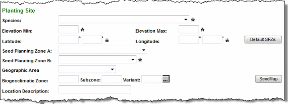- Defalt SPZs -- click this button to automatically populate the Seed Planning Zone field(s) and the BGC Zone, Subzone and Variant. The details displayed will correspond with the planting location information you have entered. Note that you must enter the Latitude and Longitude fields in order for this button to function.
