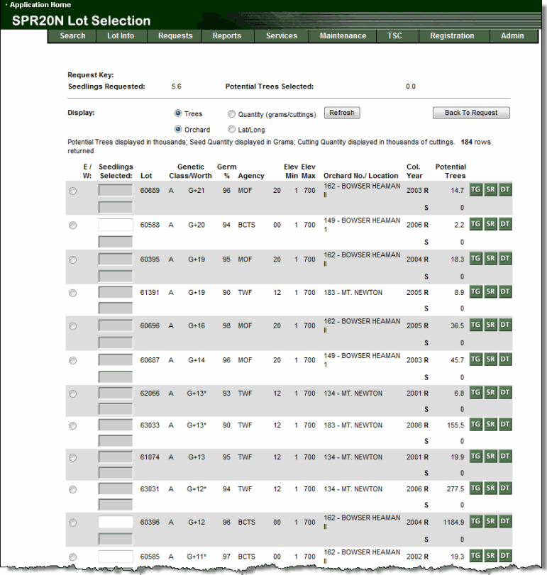 Select the appropriate Seedlot or Vegetative Lot to meet your request.