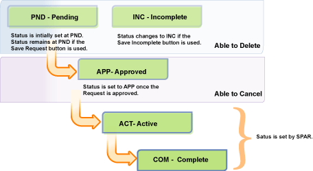 Pending - awaiting conclusion or confirmation. Use PND for future planning or for requests awaiting approval. When the status is PND, you can use DELETE mode.