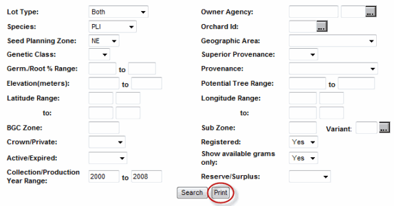Lot Search screen. To promote the use of the highest quality Seedlots and Vegetative
