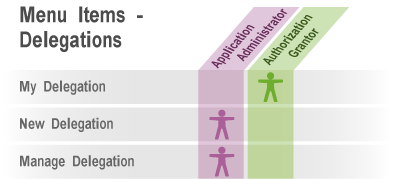 The following matrix illustrates the ADAM Delegation menu items available to the Application Administrator and Authorization Grantor (once he/she has received a delegation).