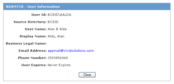 Note that the Expires field is set in the Authentication System (the BCeID or IDIR directory). This date can not be changed in ADAM. |