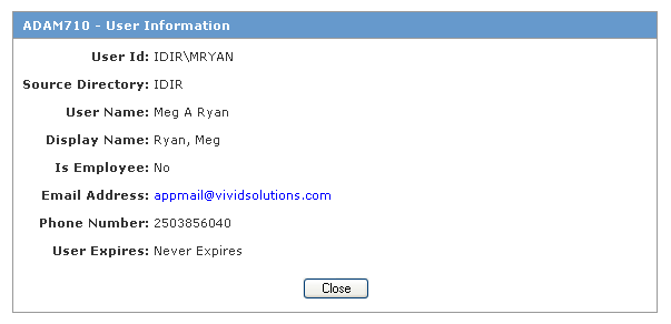 This page is displayed automatically once the User ID is clicked on various pages. For example, the Update Delegation page, Update Authorization page, Manage Delegations page, Manage Authorizations page, and Manage Agreements Acceptance page. |